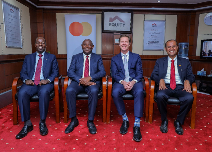 (L-R) Samuel Makome, Equity Group Chief Commercial Officer, Dr. James Mwangi, Equity Group Managing Director and CEO, Mark Elliott, Division President for Sub Saharan Africa at Mastercard and Shehryar Ali, Senior Vice President - Country Manager for East Africa at Mastercard during the signing of a 10 year partnership agreement that that will deliver innovative solutions for various customer segments including e-commerce payments, cross border payments, community pass for farmers and small businesses, QR and tap on phone.