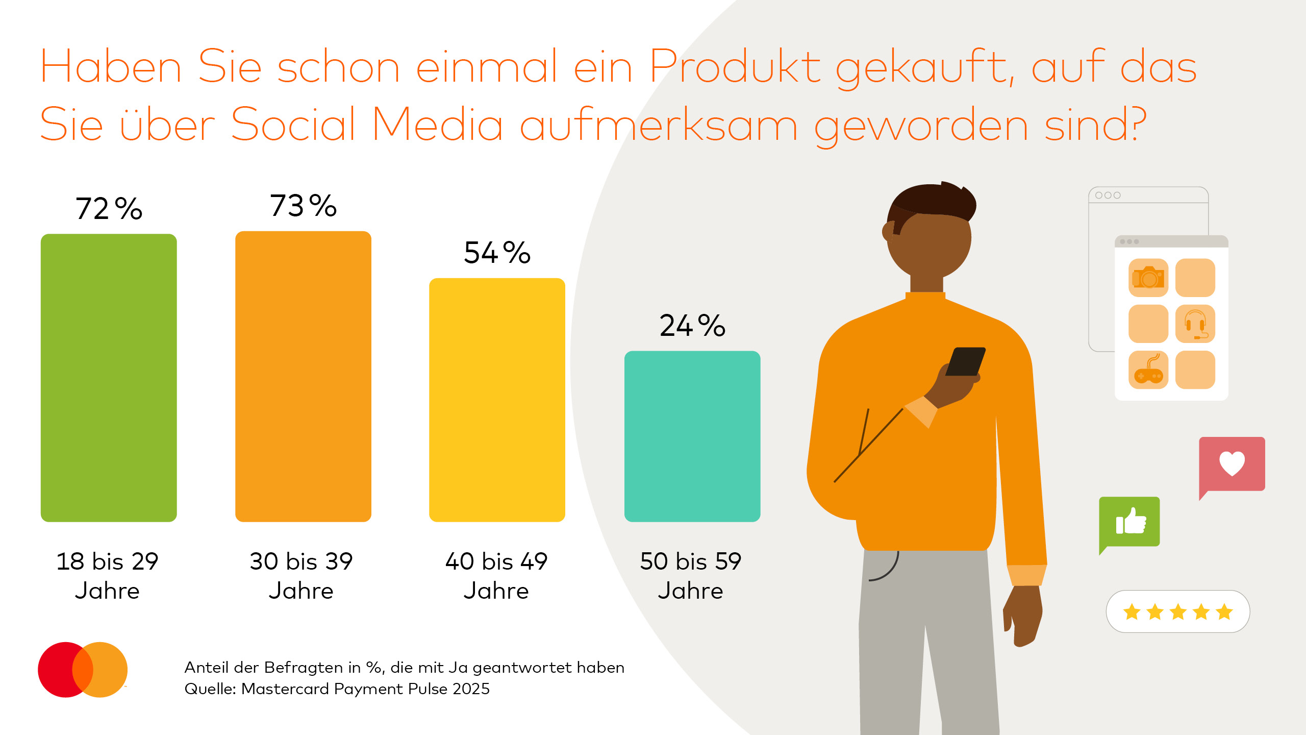 Laut Mastercard Payment Pulse sind 45 Prozent der Deutschen schon einmal über Social Media auf ein Produkt aufmerksam geworden, das sie später kauften. Bei den 18–29-Jährigen liegt dieser Anteil sogar bei rund 73 Prozent. Rund ein Drittel der Gen Z erwartet außerdem, dass Direktkäufe über Social-Media-Plattformen in fünf Jahren selbstverständlich sein werden.