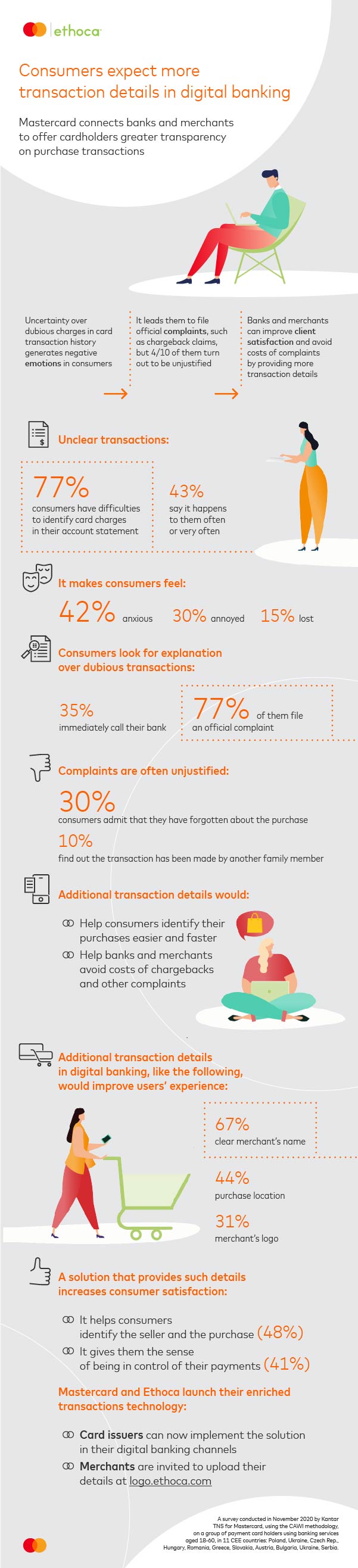 Mastercard is introducing a new solution for digital banking that provides cardholders with more details on their purchases. Delivered by Ethoca, a Mastercard company, the new product will enhance consumers’ digital experiences by supplying them with additional transaction details, such as a merchant’s name, logo, and location of the purchase. Merchants are invited to upload their logos to the system in order to increase the visibility of their brand and reduce transaction confusion that leads to unnecessary chargebacks. Furthermore, Mastercard is working with issuers on introducing a new industry standard so that enriched transaction information is enabled in digital banking channels by 2022.