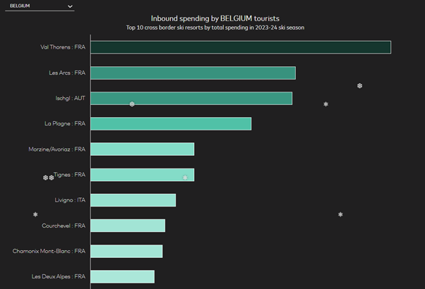 - Dans le top 10 des stations les plus prisées par les Belges, on retrouve par ordre croissant : Val Thorens (France), Les Arcs (France), Ischgl (Autriche), La Plagne (France), Morzine/Avoriaz (France), Tignes (France), Livigno (Italie), Courchevel (France), Chamonix Mont-Blanc (France) et Les Deux Alpes (France).