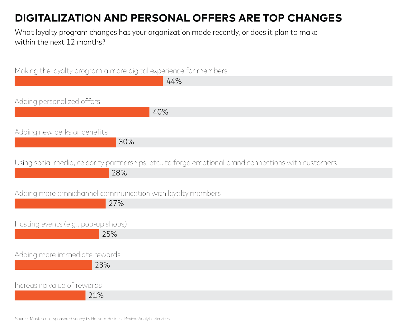 • Become digital-first: Of respondents whose companies recently made changes to their loyalty strategy or are planning changes within the year, the top reason was to create a more digital experience (44%).
