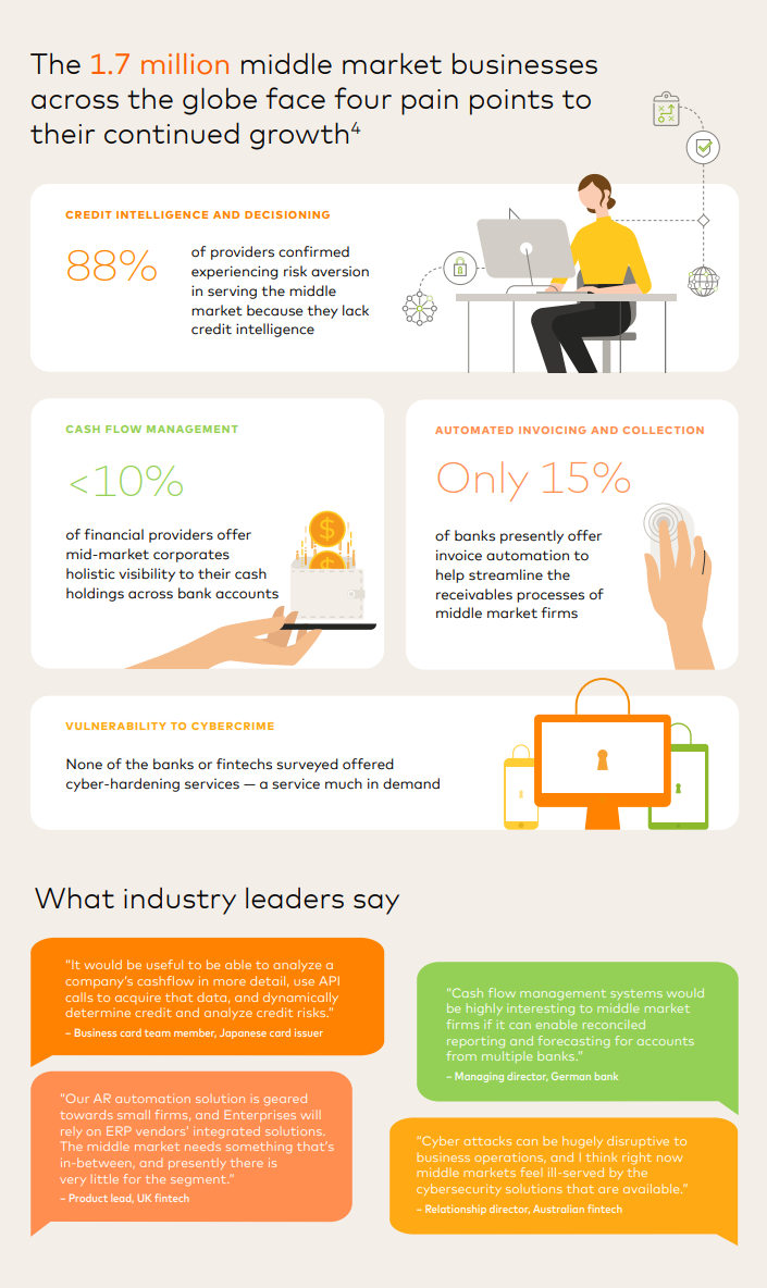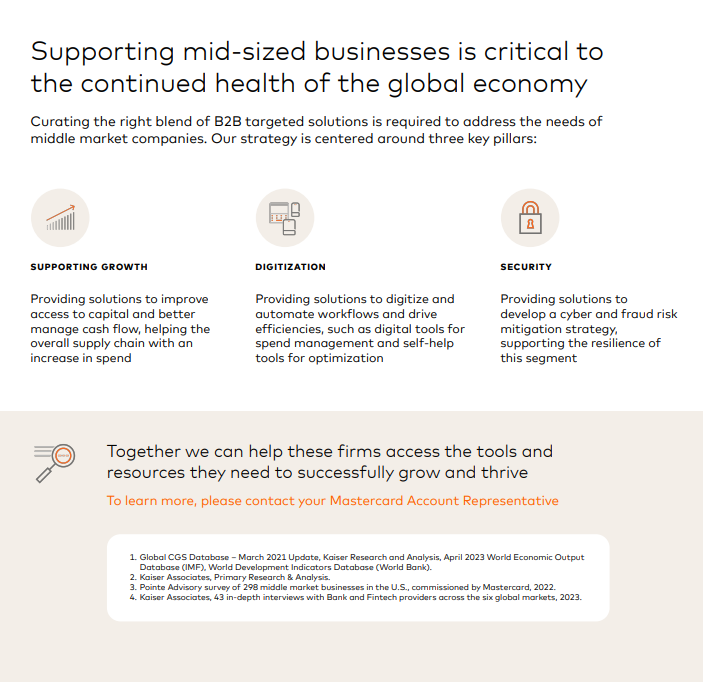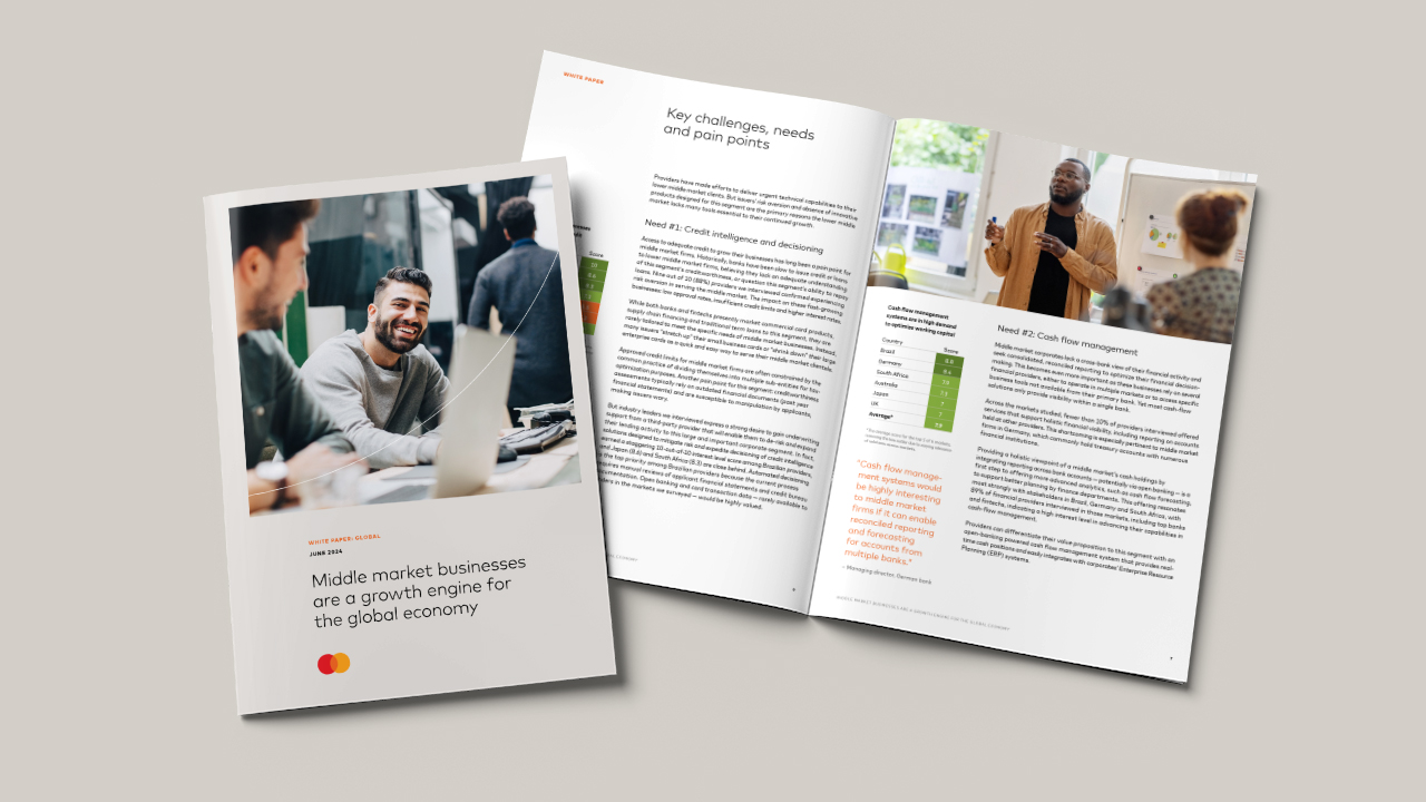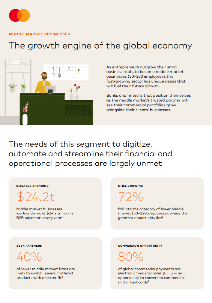 In this report, we identify the key challenges, needs, and pain points of middle market companies and offer strategic takeaways for banks and fintechs looking to capture a greater share of this critical, yet often overlooked segment. From rising demand for solutions tailored to cash flow management, to the need for better defense against cybercrime, Mastercard sees an untapped opportunity to help the middle market gain the resources they need to achieve their full potential.