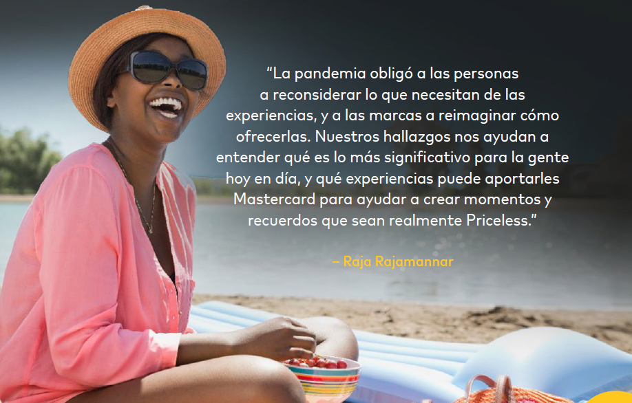 “Durante mucho tiempo, Mastercard ha sido una marca que ayuda a las personas a conectarse entre sí y con sus pasiones y aficiones”, comenta Raja Rajamannar, Jefe de Mercadotecnia y Comunicación de Mastercard Global. “La pandemia obligó a las personas a reconsiderar lo que necesitan de las experiencias, y a las marcas a reimaginar cómo ofrecerlas. Los resultados de la investigación nos ayudan a entender qué es lo más significativo para la gente hoy en día, y qué experiencias podemos ofrecerles para ayudarles a crear oportunidades y recuerdos que sean verdaderamente Priceless.”