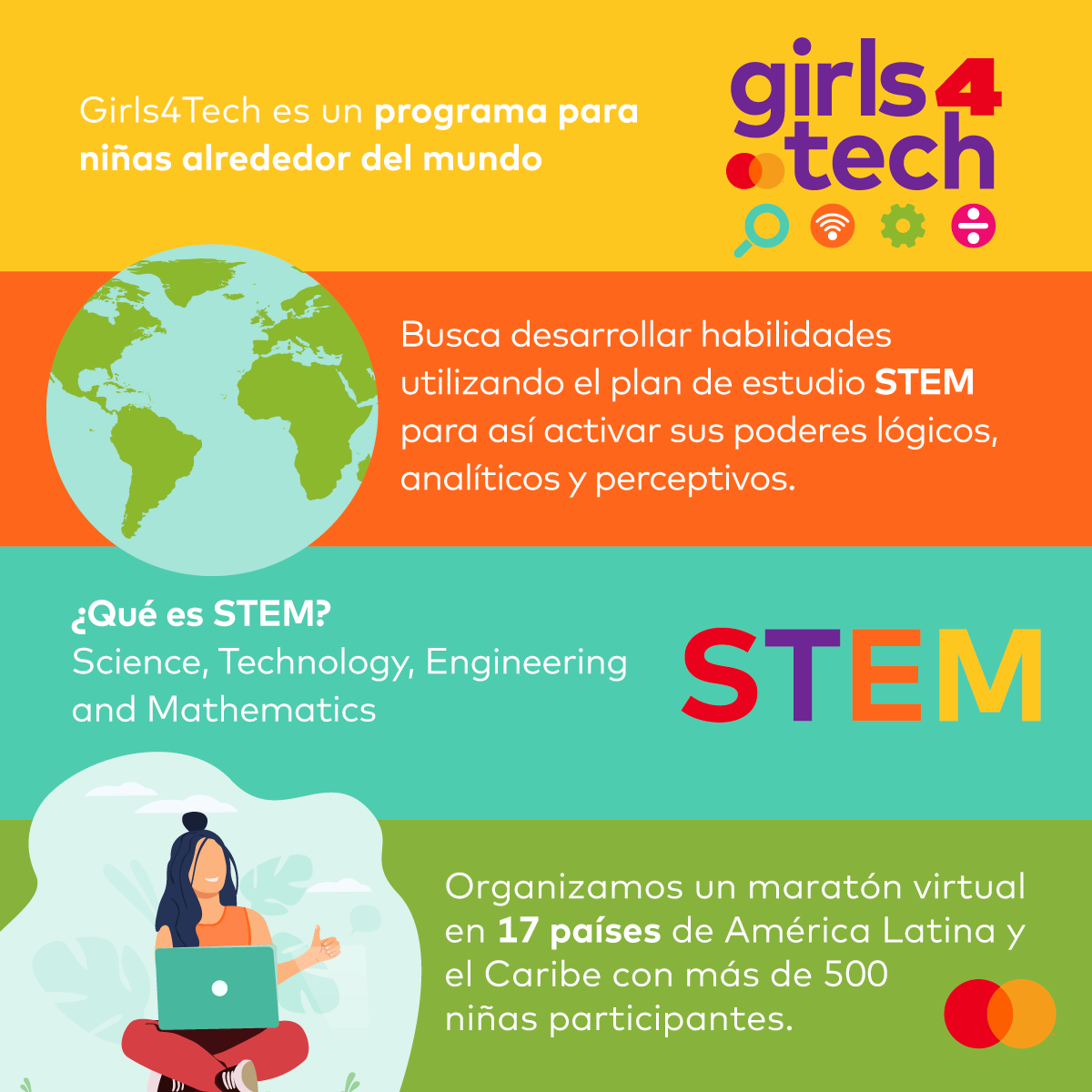 Girls4Tech es un programa educativo exclusivo de Mastercard, diseñado para niñas alrededor del mundo, con el objetivo de inspirar a las niñas a desarrollar habilidades STEM para convertirse en las líderes del mañana e impulsar el porcentaje de participación femenina en estas áreas. Este programa práctico conecta los fundamentos del negocio con los principios de ciencia, tecnología, ingeniería y matemáticas (STEM) para mostrar a las niñas los intereses y habilidades necesarios para desarrollar una carrera en estas áreas.