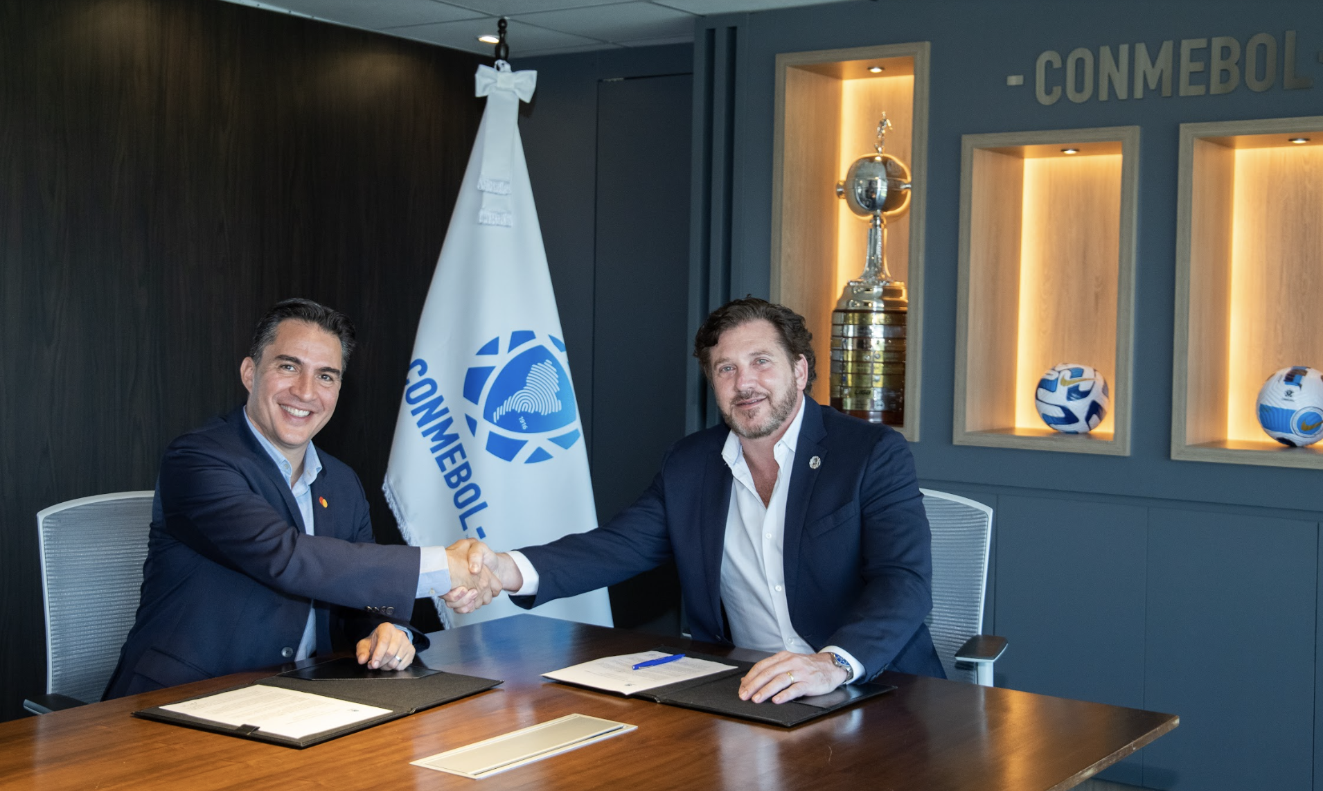 Roberto Ramírez Laverde, SVP de Mercadotecnia y Comunicación, Mastercard América Latina y el Caribe y Alejandro Dominguez, Presidente de la CONMEBOL en la renovación del contrato de patrocinio de Mastercard con la CONMEBOL Libertadores y CONMEBOL Libertadores Femenina.
