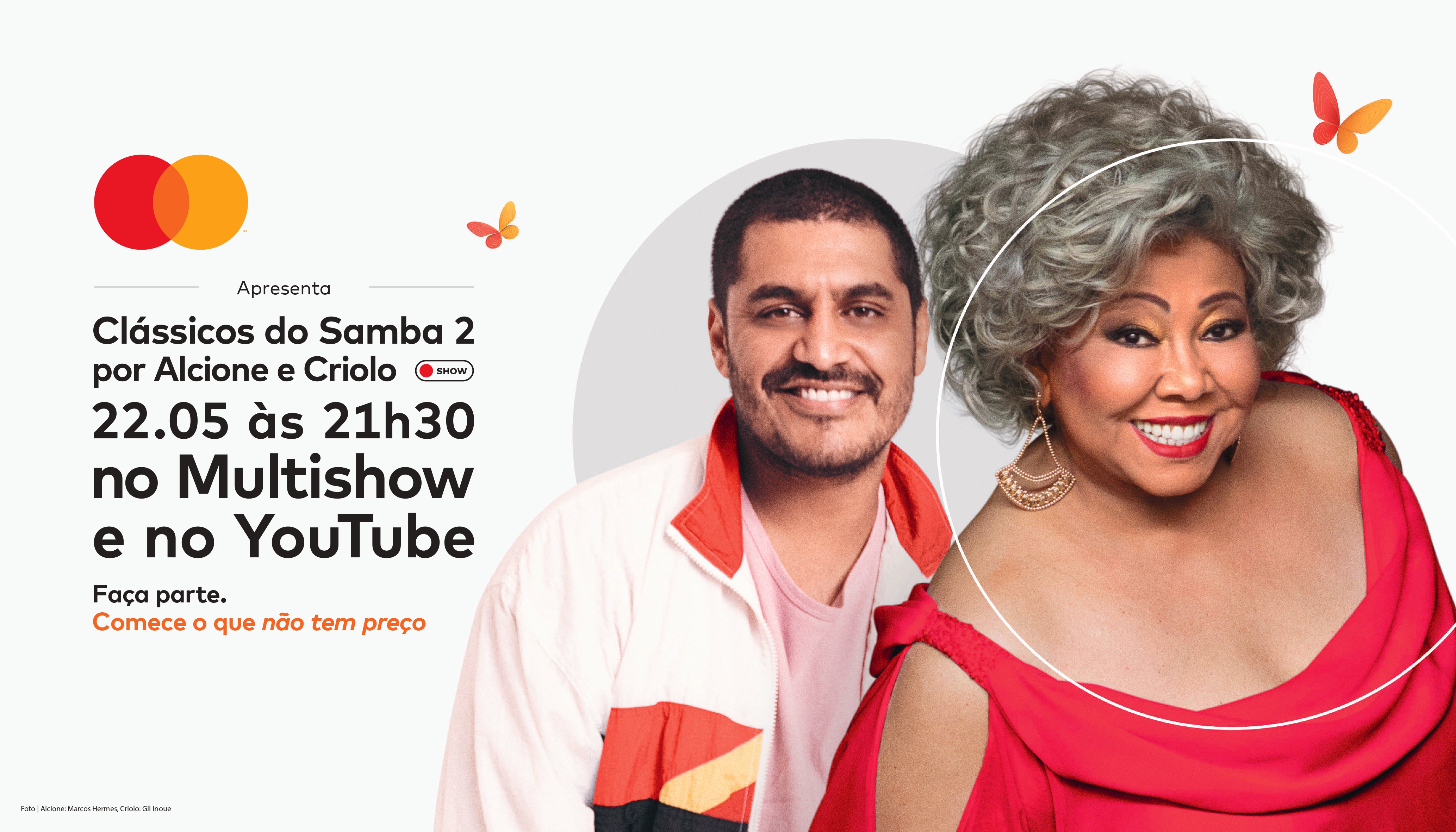 No dia 22 de maio, sábado, às 21h30, a Mastercard promove o primeiro encontro musical entre Alcione e Criolo, duas lendas da música brasileira. Para o show, a rainha do samba e o rapper indicado ao Grammy Latino de 2019 cantarão grandes sucessos do gênero musical mais brasileiro de todos. A live será transmitida no canal do YouTube da Mastercard Brasil e no Multishow.