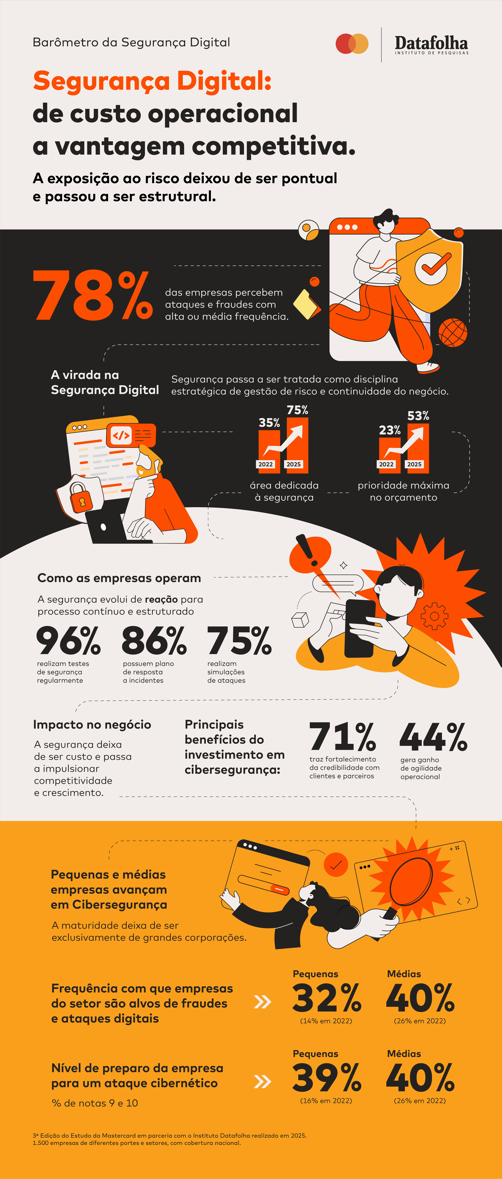 A segurança digital consolidou-se como um pilar estratégico e habilitador de negócios no Brasil, e não mais como um mero centro de custos. É o que revela a terceira edição do Barômetro da Segurança Digital, estudo encomendado pela Mastercard ao Instituto Datafolha. A pesquisa, realizada com tomadores de decisão da área de TI de empresas de pequeno, médio e grande porte dos setores de varejo, tecnologia, telecom, finanças, seguros, saúde e educação, aponta uma evolução significativa na maturidade, nos investimentos e na preparação das empresas contra ameaças cibernéticas nos últimos anos.