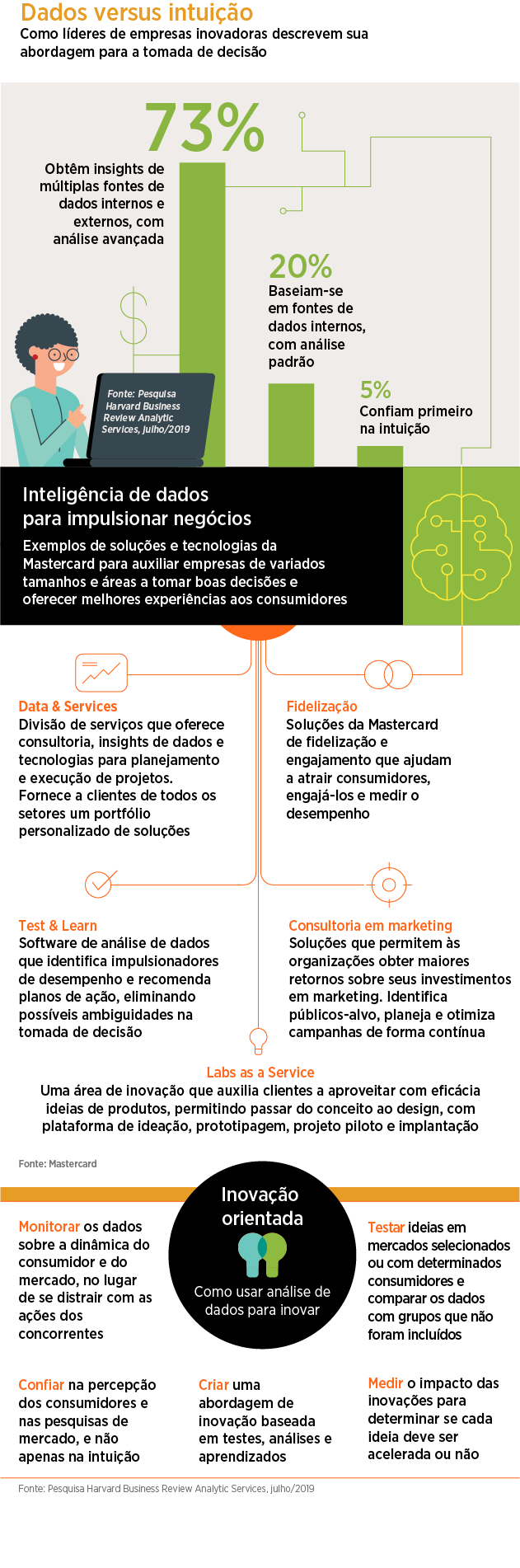 Uma pesquisa realizada pela Harvard Business Review Analytic Services, em parceria com a Mastercard, mostrou que 73% dos líderes de empresas inovadoras trabalham com insights de múltiplas fontes de dados, internos e externos, e análise avançada, para suas decisões. Outros 20% baseiam-se em fontes de dados internos, com análise padrão, e apenas 5% dizem confiar primeiramente na intuição.