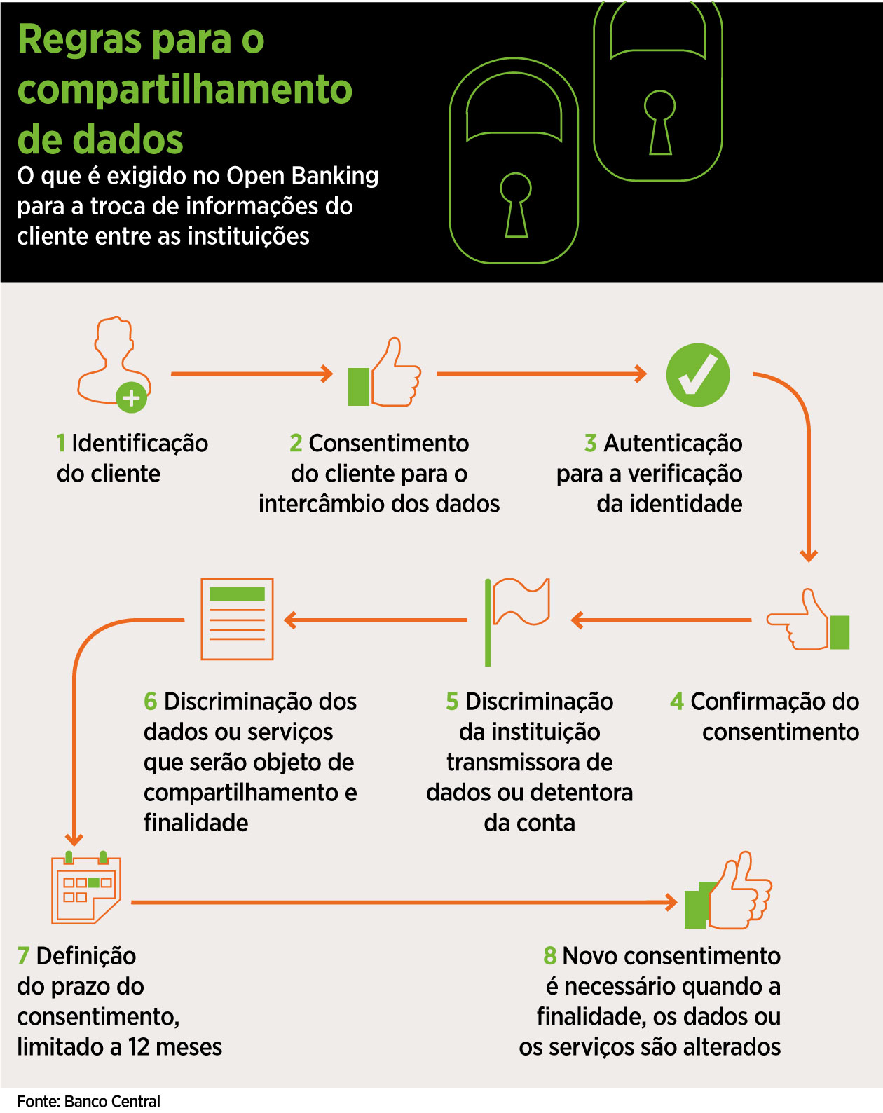 Garantir a confiança do consumidor é um dos maiores desafios do sistema financeiro aberto. As regras definidas pelo Banco Central do Brasil para o compartilhamento de informações do consumidor compreendem três etapas obrigatórias: consentimento do cliente (autorização para compartilhamento de dados), autenticação (verificação de identidade) e confirmação do consentimento. Somente após a conclusão dessas fases, o banco do cliente poderá liberar as informações, e apenas pelo prazo definido pelo cliente, que é limitado a 12 meses.