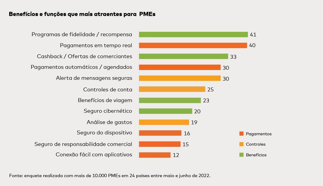 Apesar da variedade de soluções de pagamento disponíveis atualmente, os pagamentos de PMEs ainda são dominados por transferências bancárias pesadas e por dinheiro que pode vir de fonte duvidosa. E muitas PMEs que utilizam cartões de crédito ou débito usam cartões de pessoa física em vez de usar cartão de pessoa jurídica. No entanto, as contas empresariais inovadoras de hoje oferecem benefícios e serviços concebidos para desenvolver PMEs, tais como linhas de crédito dinâmicas e mais abrangentes, ofertas e recompensas personalizadas e ferramentas de gestão financeira.