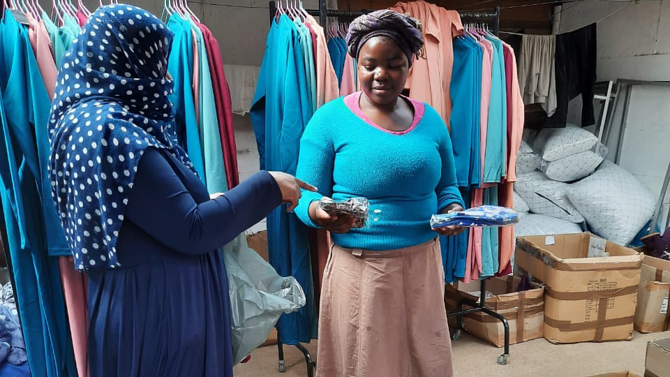 Photo: Nadia Roman, left, who is learning to grow her fashion business through a mentorship program, helps a customer at her Cape Town office.
