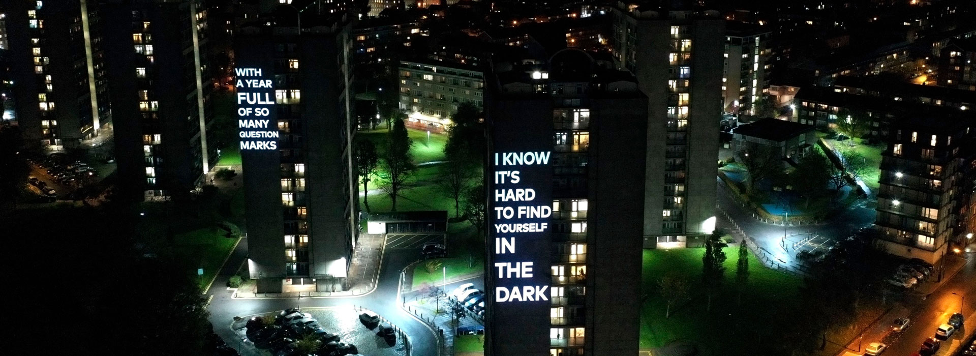 November 13, 2020 | By Hayden HarrisonThose were the words of poet and mental health campaigner Hussain Manawer that illuminated tower blocks in London and Bristol, U.K. on Nov. 11. The exhibition lasted 19 minutes, 40 seconds to raise awareness of the 19.4 million Brits who remain digitally and financially excluded and worry about their financial futures, particularly amidst the crippling pandemic.