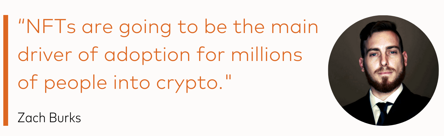 “NFTs are going to be the main driver of adoption for millions of people into crypto,” says Burks, noting that while many people are still hesitant to touch something like Bitcoin, they can more easily grasp the concept of an NFT. “It's not a financial instrument, you don't need to have Wall Street experience.”