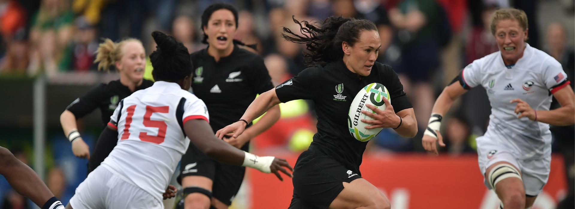 Top banner: The New Zealand national women's rugby team powers past the U.S. team in the semifinals of Rugby World Cup 2017.  (Photo courtesy of World Rugby)