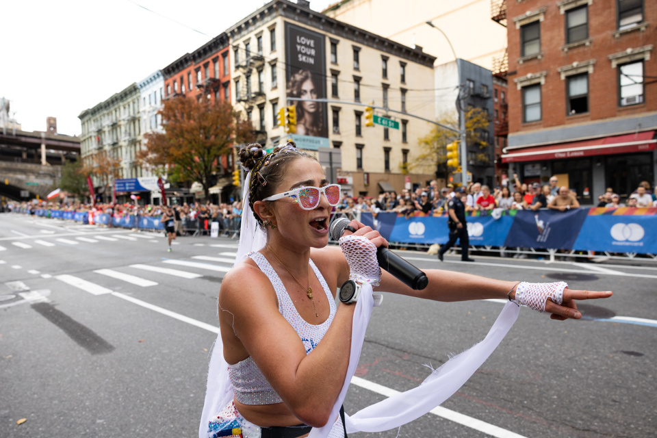 Pappas: I was supposed to run with the elite athletes, about 30 minutes after the Priceless Start, but I had surgery less than a year prior and I wasn’t able to run at their pace … I was just really nervous. I’m going to be alone if I run slower than seven minutes. And my mentor where I live was like, “You gotta do it, this is such a rare opportunity to have the whole streets of New York and all the people, you know, cheering and everything.” And so I hired a makeup designer to put glitter and stars on my face because I wanted to indicate to myself and also to the crowd who might recognize me that it was intentional and I was okay.