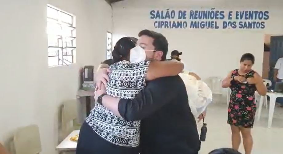 Mastercard's Philipe Moura gets a hug from a member of the women's sewing collective he helped spark in Sitio Tambor. (Photo courtesy of Philipe Moura)