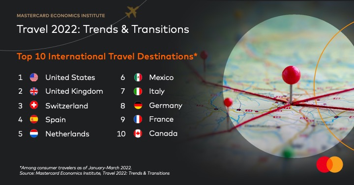 Experts at the United Nations’ World Tourism Organization do not expect the industry to fully recover until 2024, and Mastercard research signals that more developed and diversified economies are leading the travel recovery — the U.S., the U.K., Switzerland, Spain and Netherlands are topping the list of booking destinations.