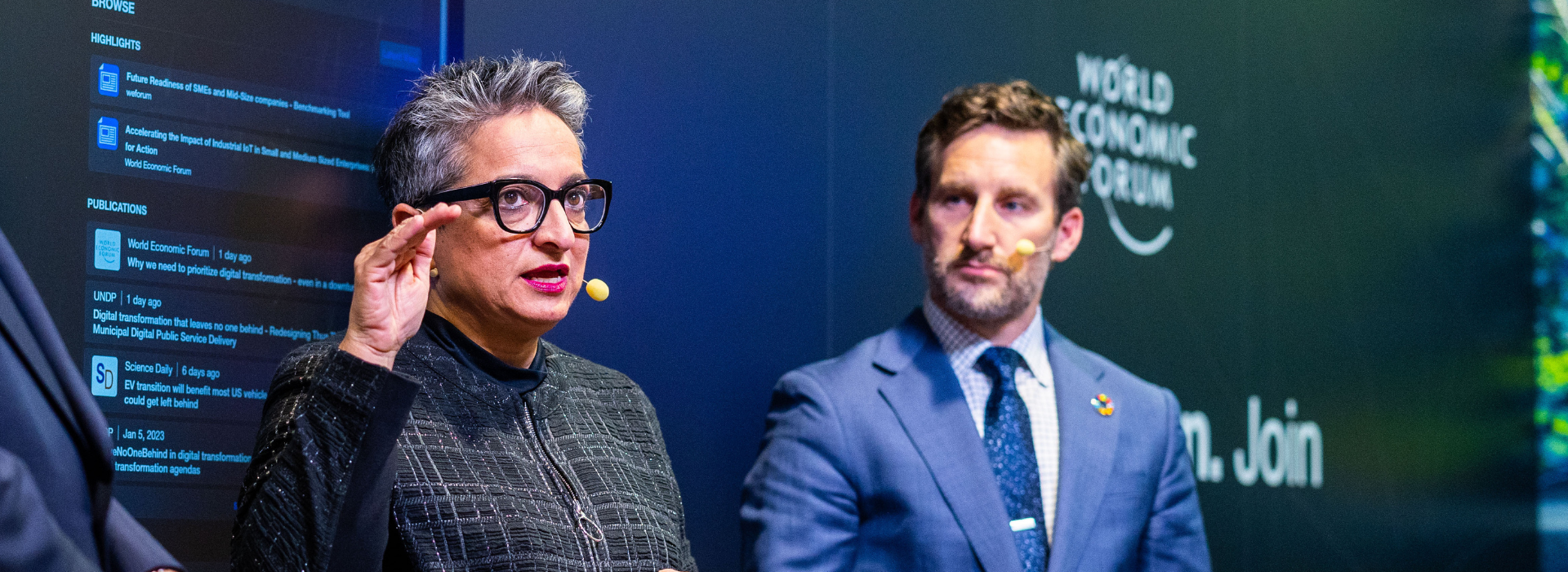 Banner photo: Mastercard's Shamina Singh with Jeff Merritt, a WEF executive committee member and head of urban transformation, at the panel "The Big Opportunity Behind Small Businesses." (Photo: Ciaran McCrickard/World Economic Forum)