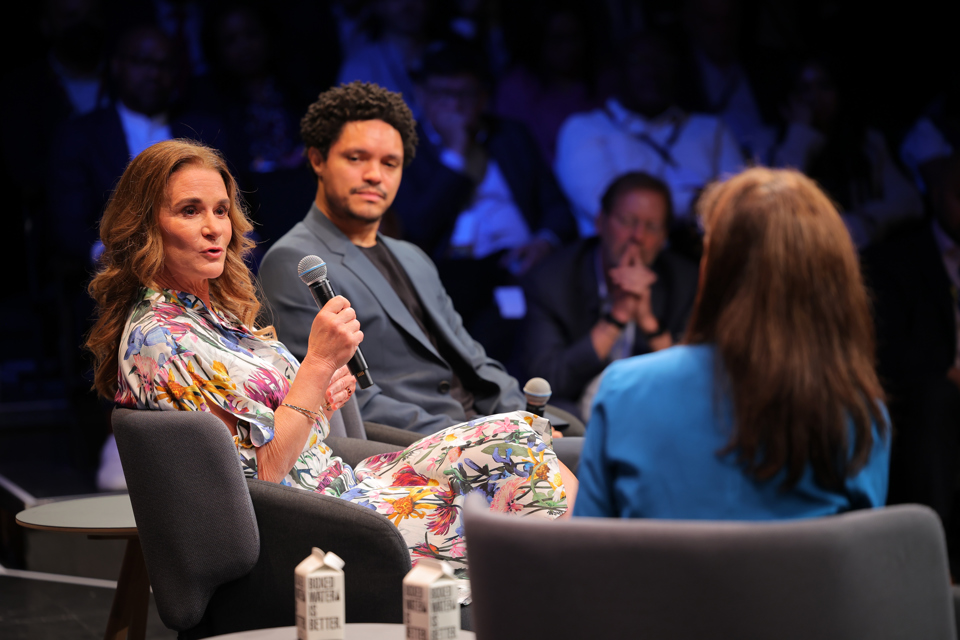 Philanthropist Melinda French Gates, left, discusses how the gender pay gap creates more turnover and higher levels of poverty with Trevor Noah, left, and MSNBC contributor Maria Teresa Kumar. (Photo credit: Isaac Latimer)