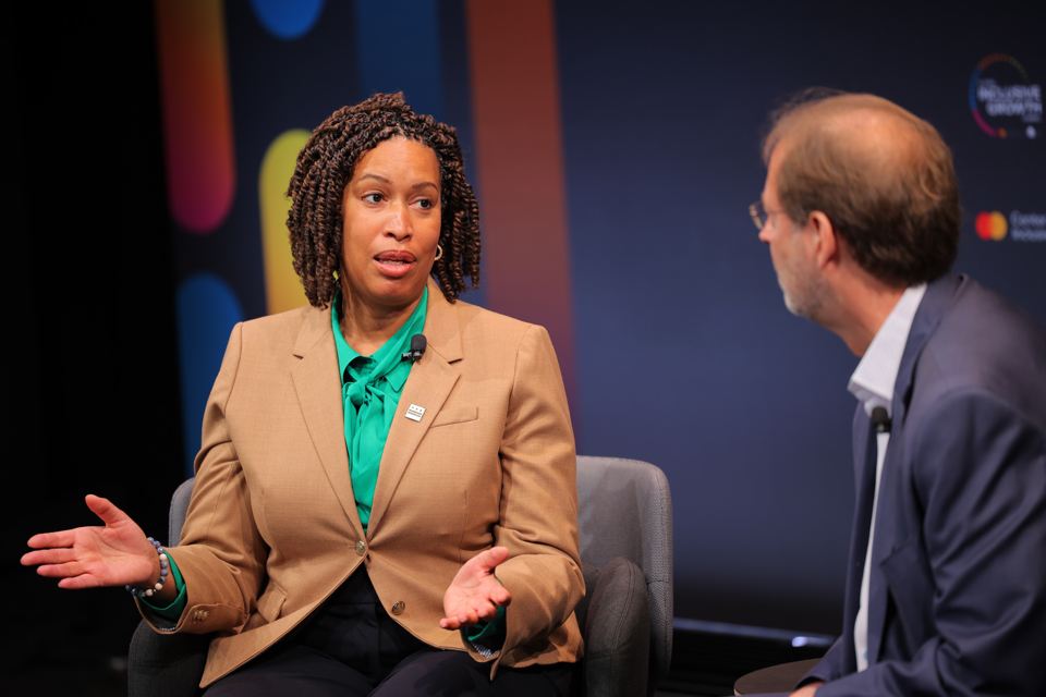 Washington, D.C. Mayor Muriel Bowser, left, and Dan Porterfield, the president and CEO of the Aspen Institute, kicked off the summit with a discussion of place-based solutions as a key to financial inclusion. (Photo credit: Isaac Latimer)