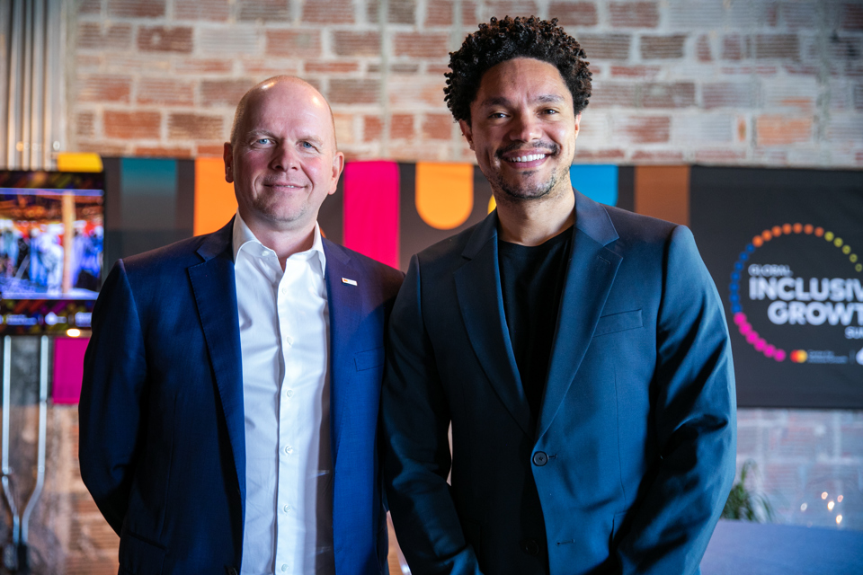 Mastercard CEO Michael Miebach and comedian Trevor Noah backstage at the Mastercard Global Inclusive Growth Summit, held in Washington, D.C. April 13. (Photo credit: Rebecca Abraham)