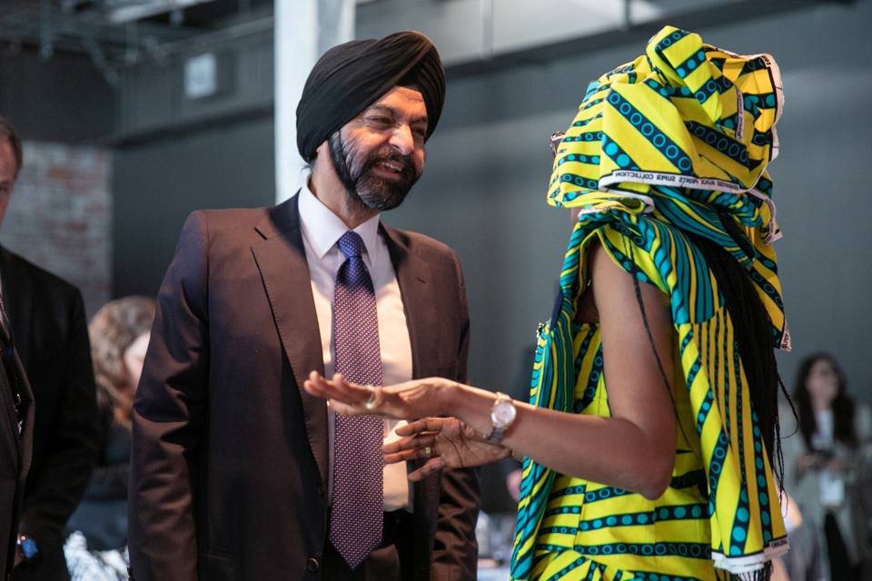 Former Mastercard CEO Ajay Banga, the U.S. nominee to lead the World Bank, chats backstage at the summit with Hindou Ibrahim, president of the Association for Indigenous Women and Peoples of Chad, who spoke on the environmental challenges currently being faced by communities in the Lake Chad region. (Photo credit: Rebecca Abraham)