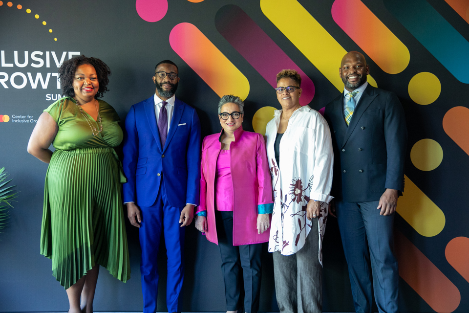 The Mastercard Center for Inclusive Growth's Salah Goss, left, and Singh, center, with Birmingham Mayor Randall Woodfin, second from left, Melissa Bradley, the manager partner of 1863 Ventures, second from right, and Coreata Houser, Birmingham's deputy director for the Department of Innovation and Economic Opportunity. Woodfin and Bradley joined Janis Bowdler, counselor for racial equity at the U.S. Department of Treasury, for a panel on how recent capital commitments have the potential to drive real, structural changes that will outlast one-time investment. (Photo credit: Rebecca Abraham)