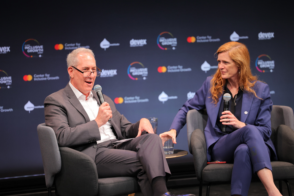 Mike Froman, left, Mastercard's vice chair and president of Strategic Growth, and USAID Administrator Samantha Power, shared insights on how public-private partnerships can build a trusted digital ecosystem that supports democratic principles and fosters inclusive and sustainable economic development. (Photo credit: Isaac Latimer)