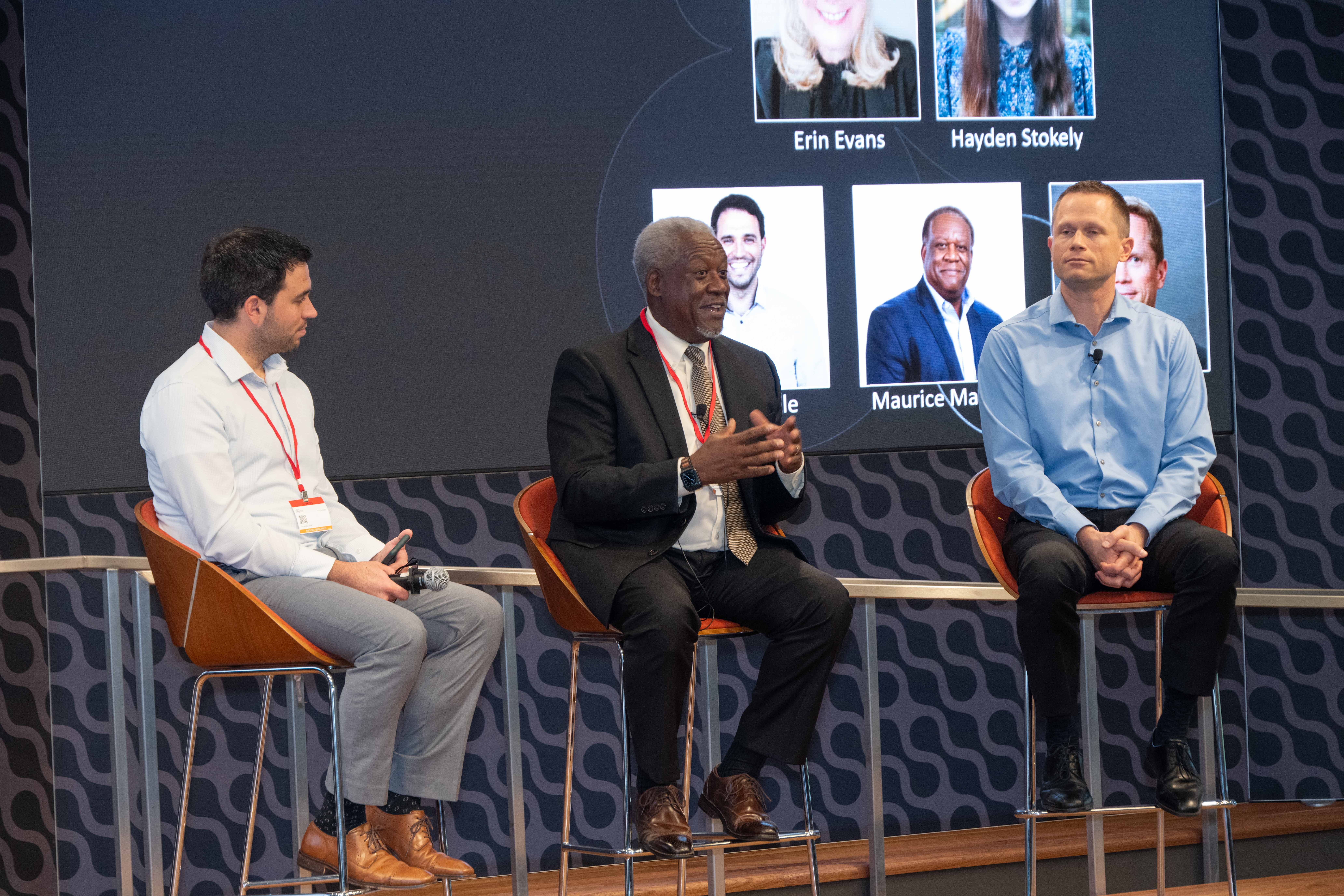 Maurice Mahone, center, at a panel on how neurodiversity can enhance workplace culture, with Joseph Riddle, left, the director of the organization Neurodiversity in the Workplace, and Barry Jacobson, Bayer Crop Science's North America transformation strategy and culture lead.