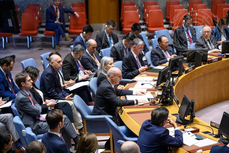 Igli Hasani (second from below at table), the Albanian minister for Europe and Foreign Affairs and president of the U.N. Security Council for the month of September, convenes Thursday's meeting on advancing public-private humanitarian partnership. (Photo credit: Loey Felipe/United Nations)