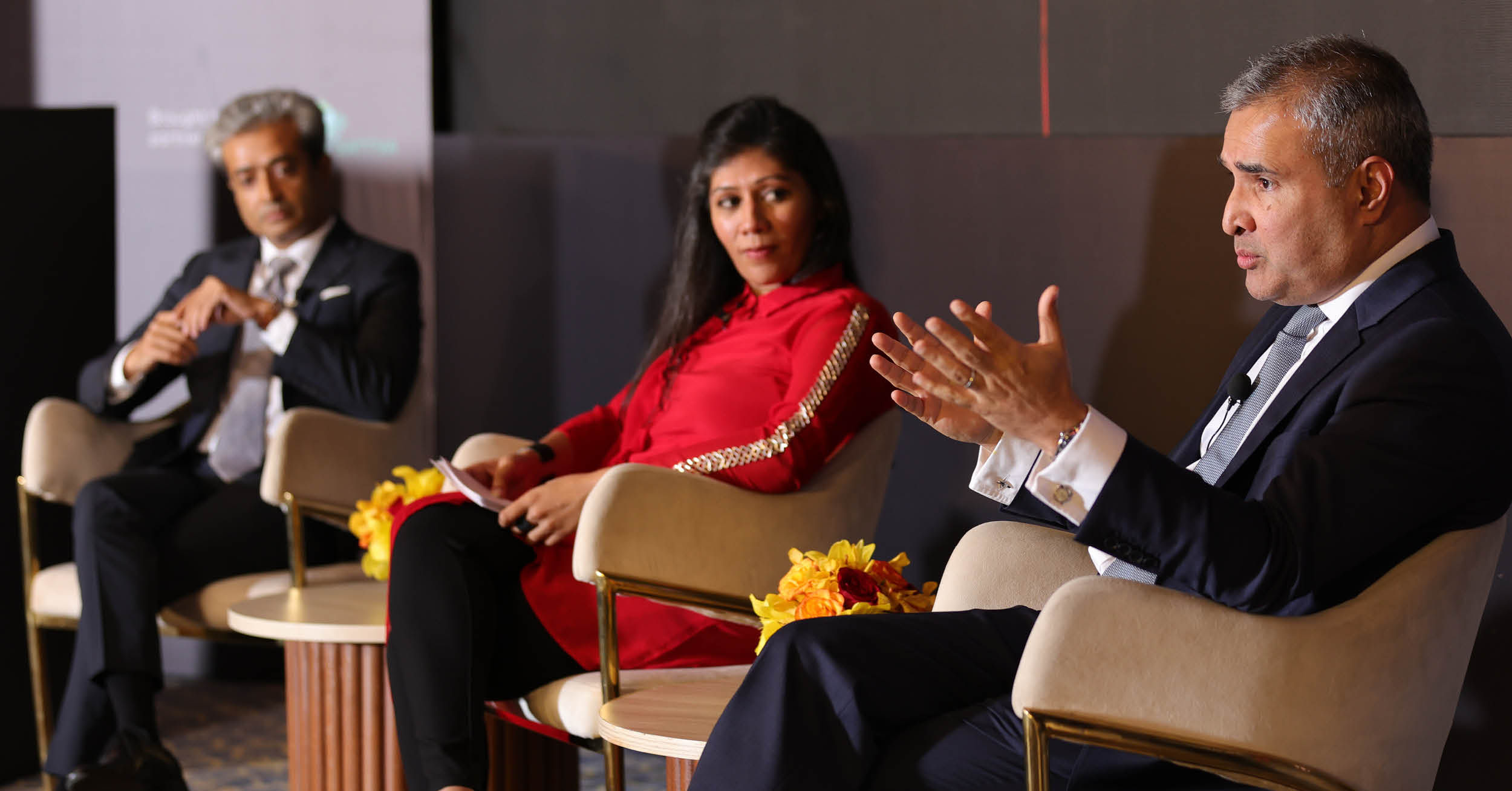 Mastercard Asia Pacific President Ari Sarker, right, with Airtel Payments Bank CEO Anubrata Biswas, left, and Frontier Markets' founder and CEO Ajaita Shah, at the Asia Inclusive Growth Forum in New Delhi Friday.