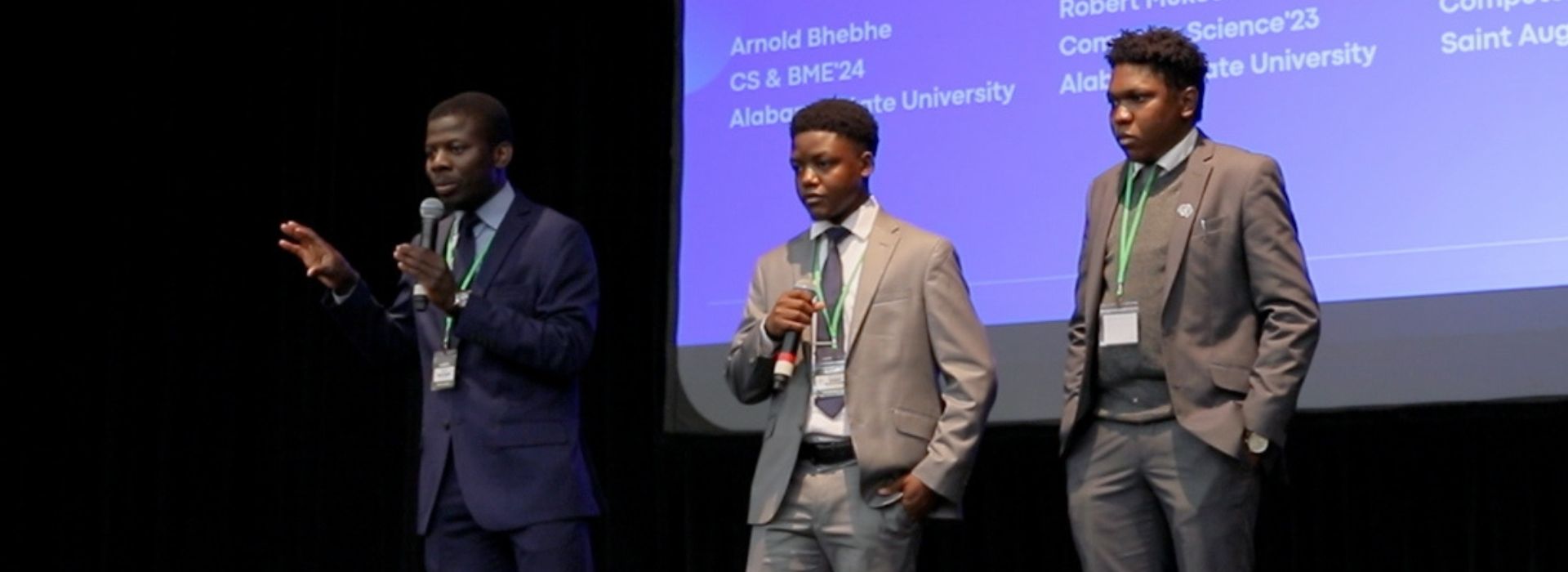Top banner: Arnold Bhebhe, left, and Robert Mukuchura, center, of Alabama State Univeristy, and Sina Ndhlovu, right, of St. Augustine's University, presenting their first response solution at the HBCU Smart City Challenge in Winston-Salem on February 18. (Photo courtesy of Pathway OZ)