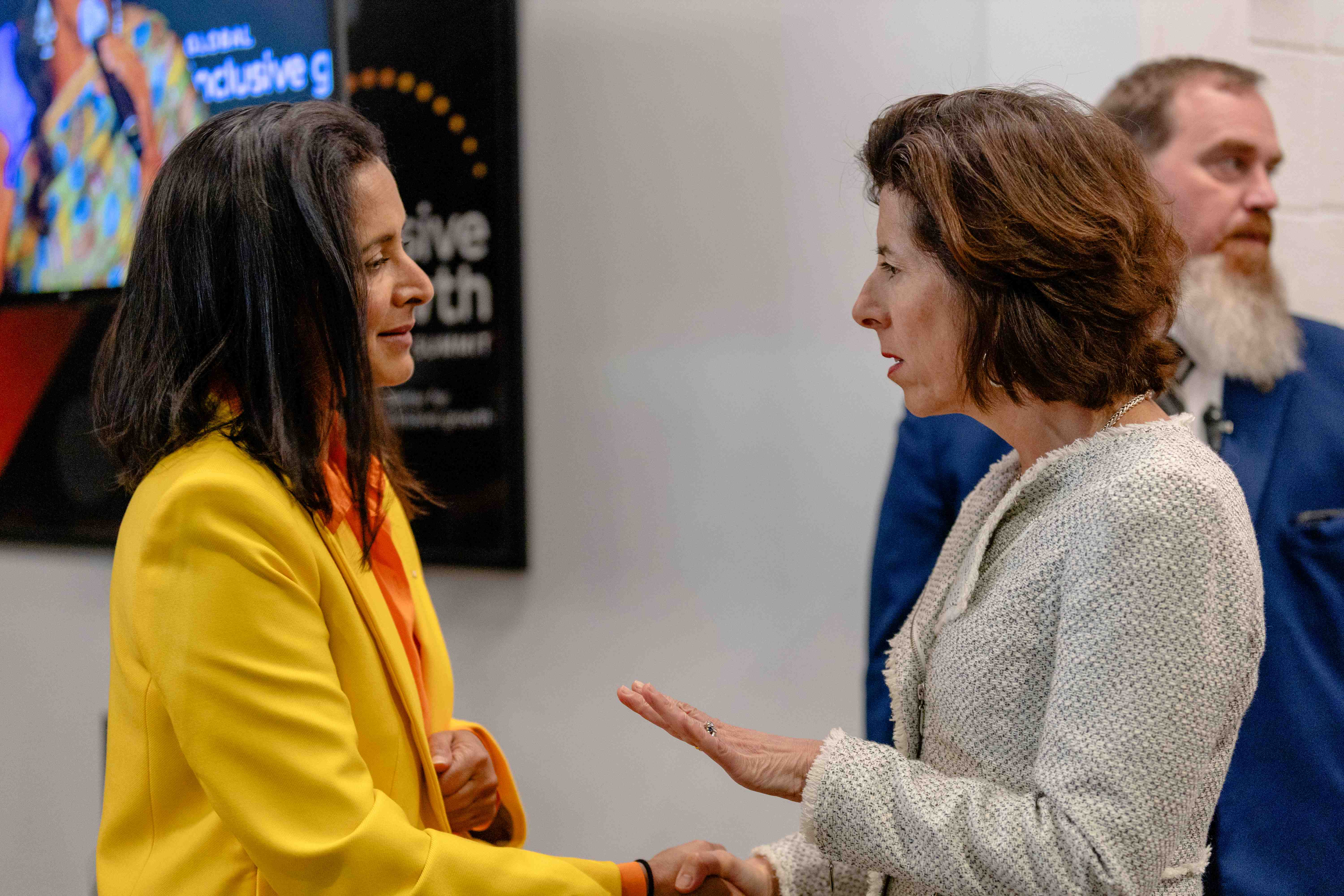 U.S. Commerce Secretary Gina Raimondo, right, speaks with Mastercard's Tara Nathan, the founder of Community Pass, which provides tools and technologies to transform marginalized communities by increasing access to services. (Photo credit: Rebecca Abraham)