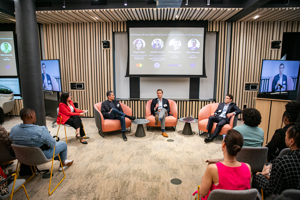 At Mastercard's Small Business Summit, Ginger Siegel, left, who leads small business for Mastercard North America, led a discussion on open banking and ways small businesses can access credit more seamlessly with Ascendus CEO Paul Quintero, second from left, Hello Alice Chief Financial Officer Matt Brewster, second from right, and Jonathan Kivell, right, director of community investments for the Federal Reserve Bank of New York. (Photo caption: Arsalan Danish/Mastercard)