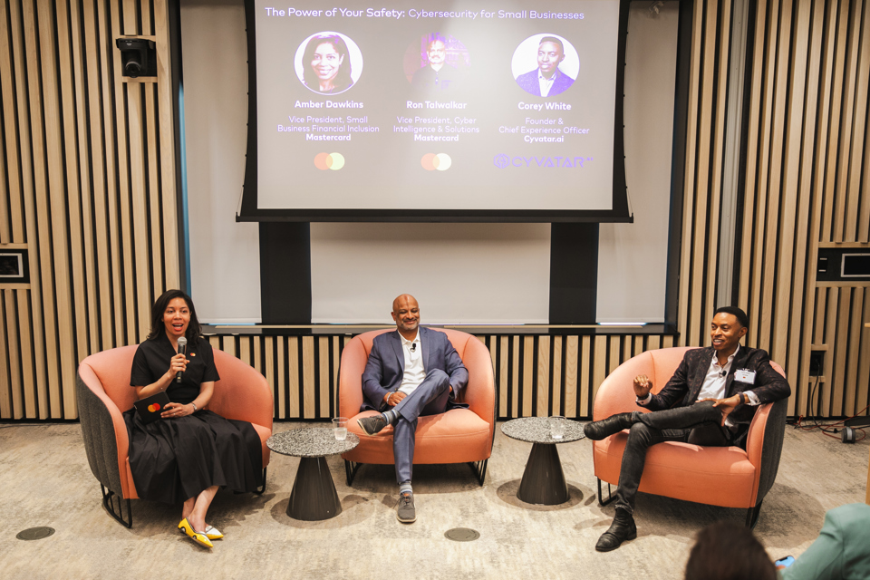Amber Dawkins, left, a vice president for small business financial inclusion at Mastercard, Ron Talwalkar, center, a vice president for cyber and intelligence solutions at Mastercard, and Corey White, the founder and chief experience officer of Cyvatar.ai, shared how small businesses can shore up their cyber defenses. (Photo credit: Arsalan Danish/Mastercard)