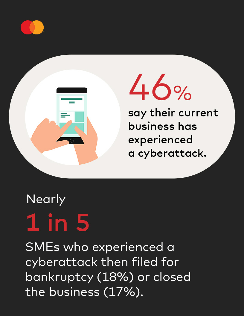 A forthcoming Mastercard survey of more than 5,000 small and medium-sized business owners across four continents reveals that 46% have experienced a cyberattack on their current business, and nearly one in five that suffered an attack then filed for bankruptcy or closed their business.