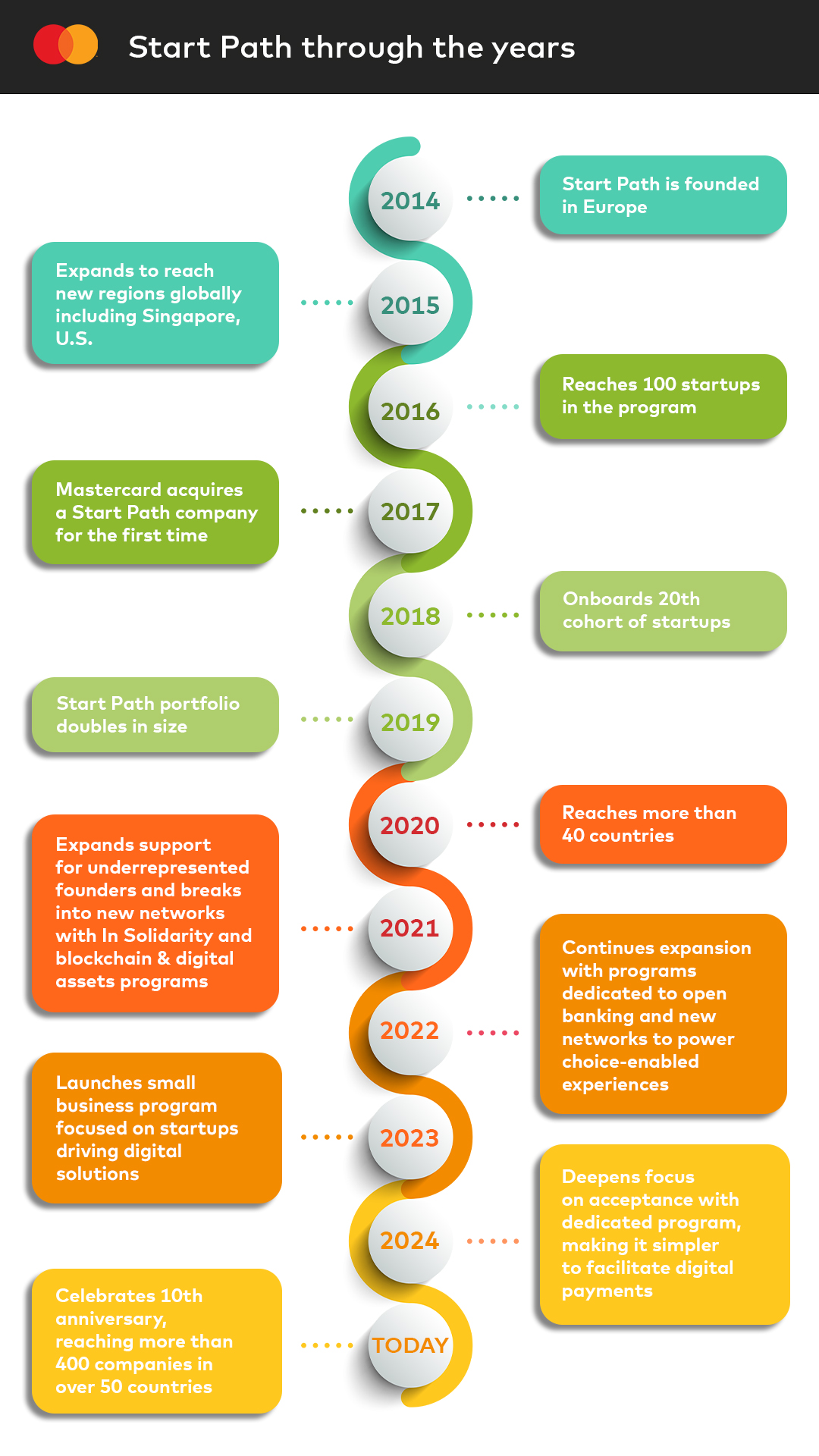 Start Path has helped scale businesses and drive sustainable growth across the industry, curating a portfolio of more than 400 startups from more than 50 countries that have collectively raised north of $25 billion in post-program capital. Many Start Path companies today are reaching unicorn status and exploring extended commercial engagements with Mastercard and our customers. The more than 15,000 connections we’ve made to get these startups in front of an audience of venture capitalists, financial institutions and governments, in turn, help make the digital economy stronger, safer and more inclusive.