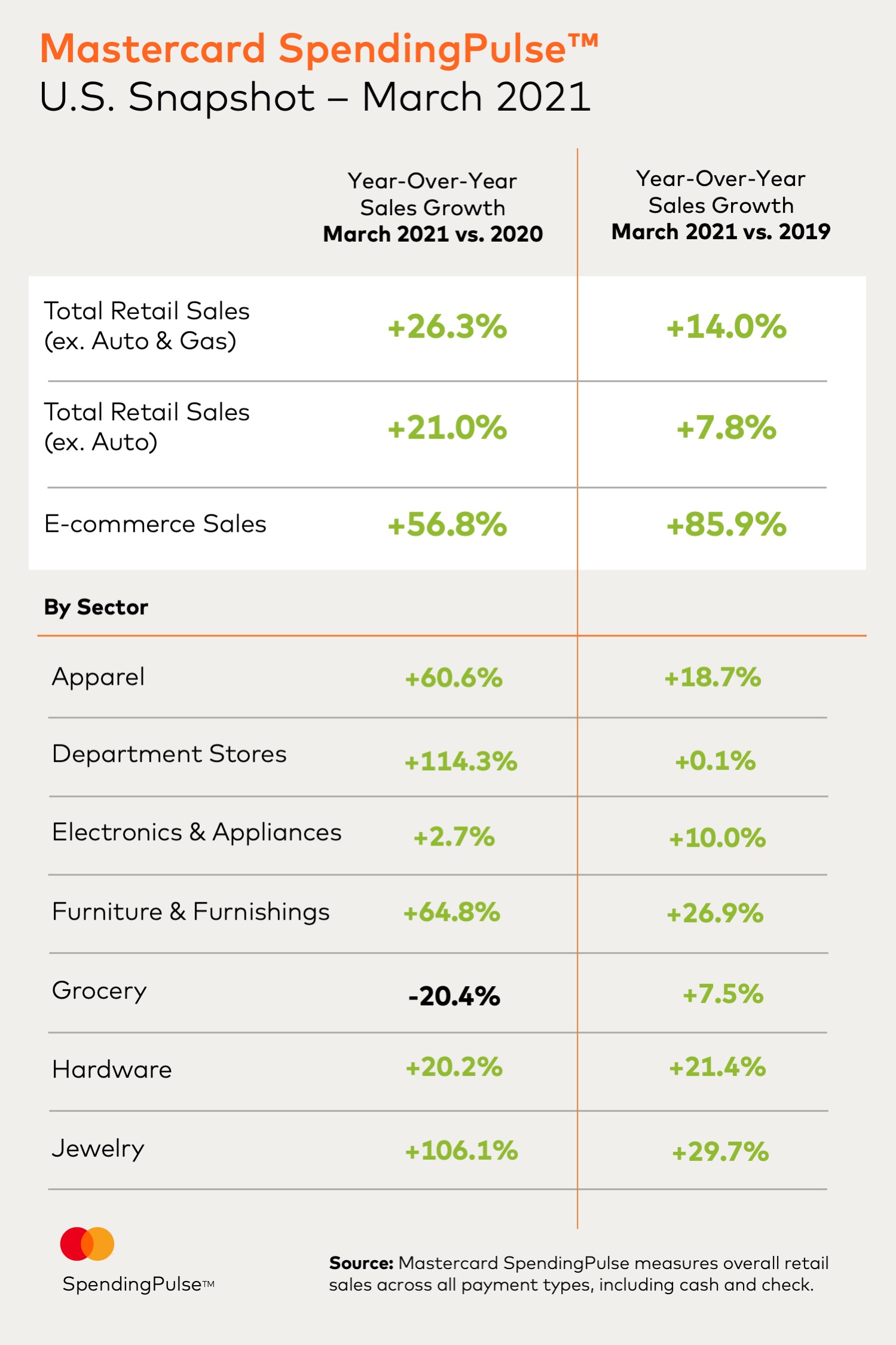 April 8, 2021 | Purchase, NYU.S. retail sales growth rates increased by double-digits in March as we hit the one-year mark since the first COVID lockdowns impacted retail sales. According to Mastercard SpendingPulseTM, U.S. retail sales excluding automotive and gasoline increased 26.3% year-over-year in March, and online sales grew 56.8% compared to 2020. Mastercard SpendingPulse measures in-store and online retail sales across all forms of payment.